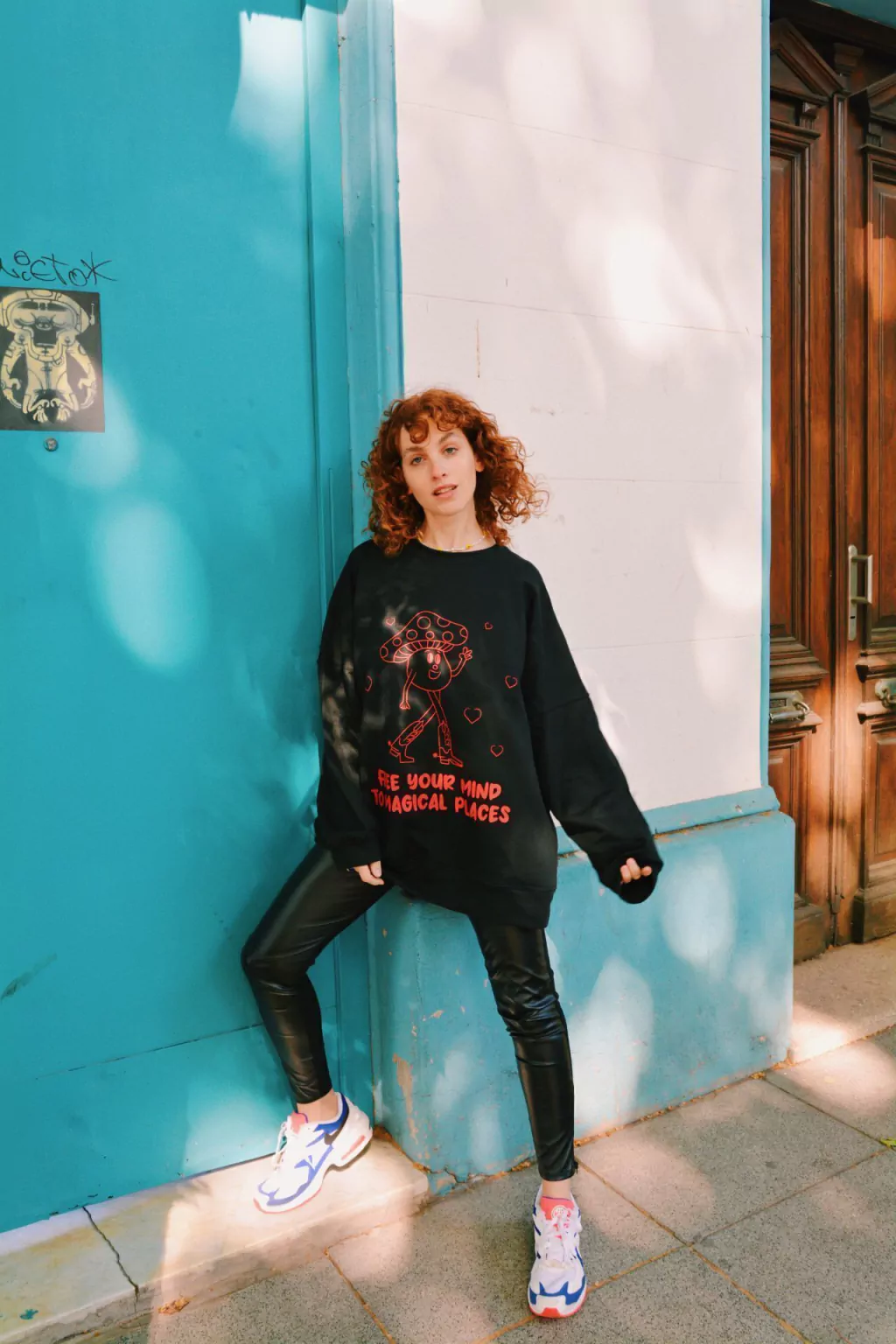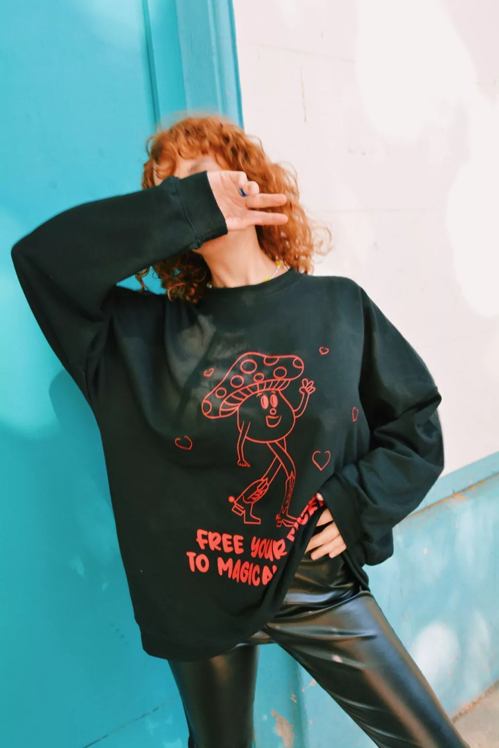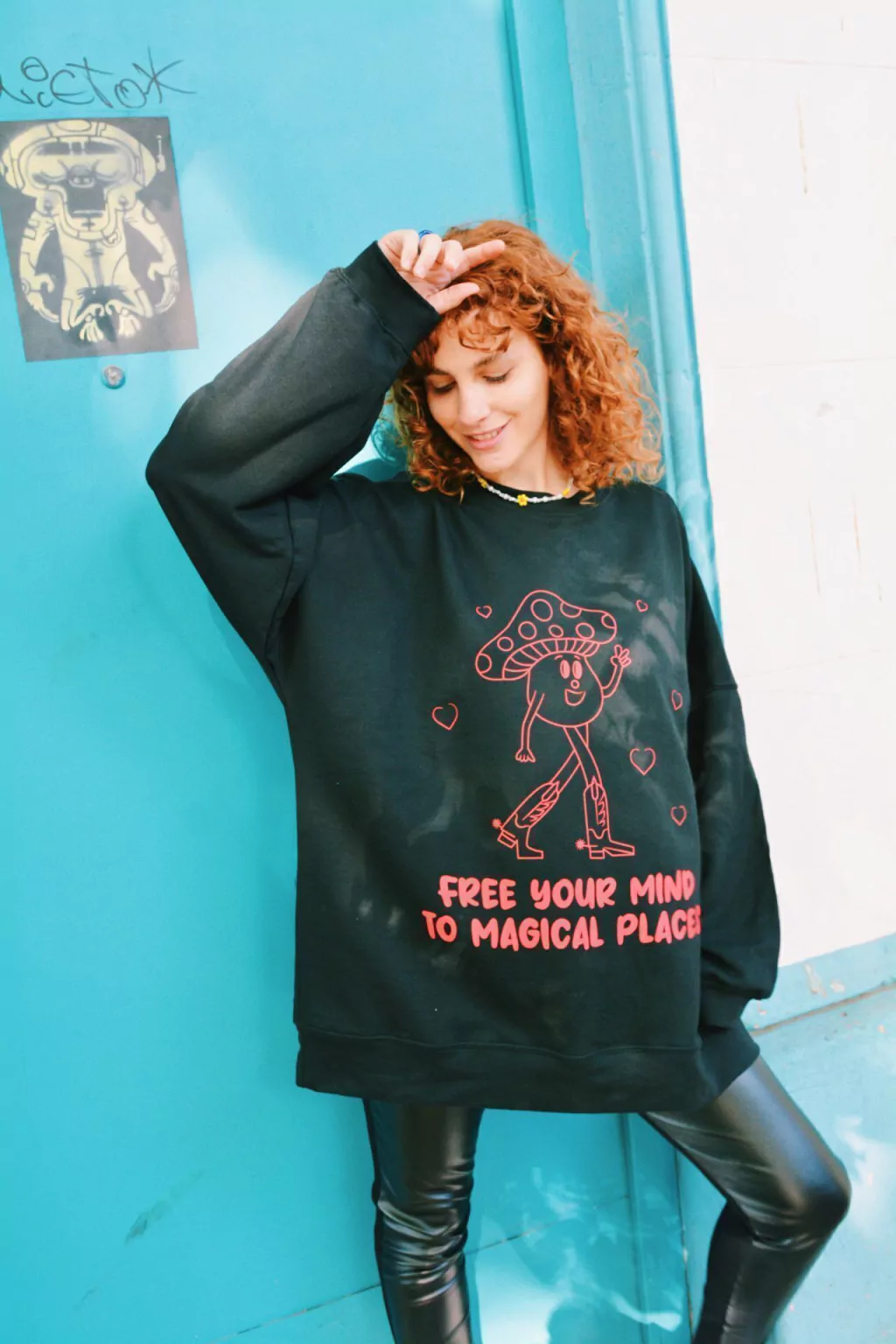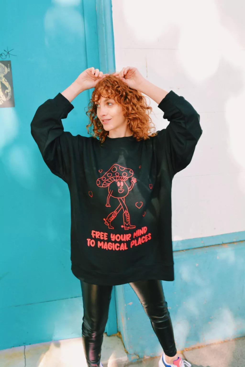 Descripción: Buzo confeccionado en tela rústico premium en color negro con estampa delantera de Miss Portobella y frase "FREE YOUR MIND TO MAGICAL PLACES" en color rojo. El corte es oversize con cuello redondo y tiene puños en las mangas.