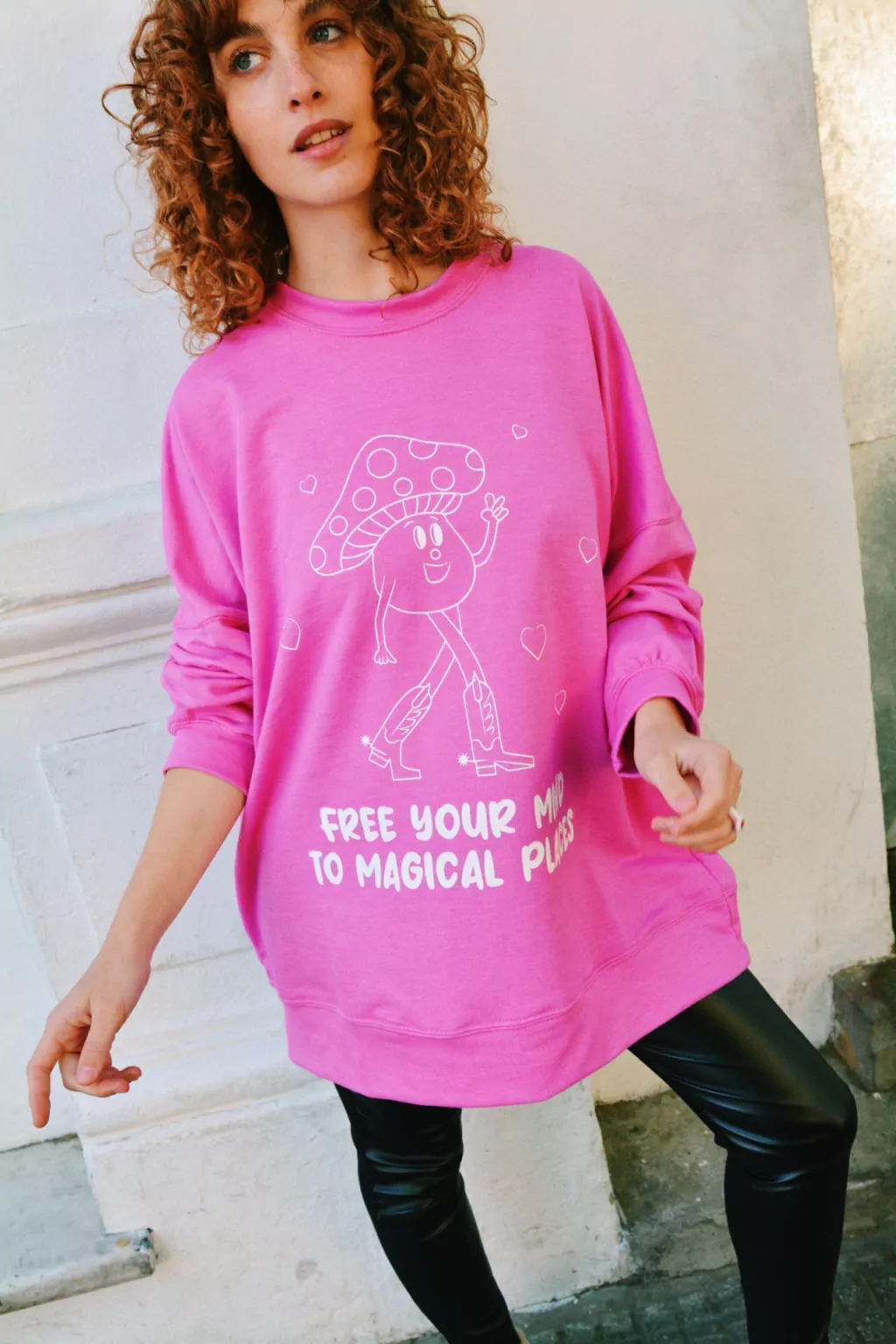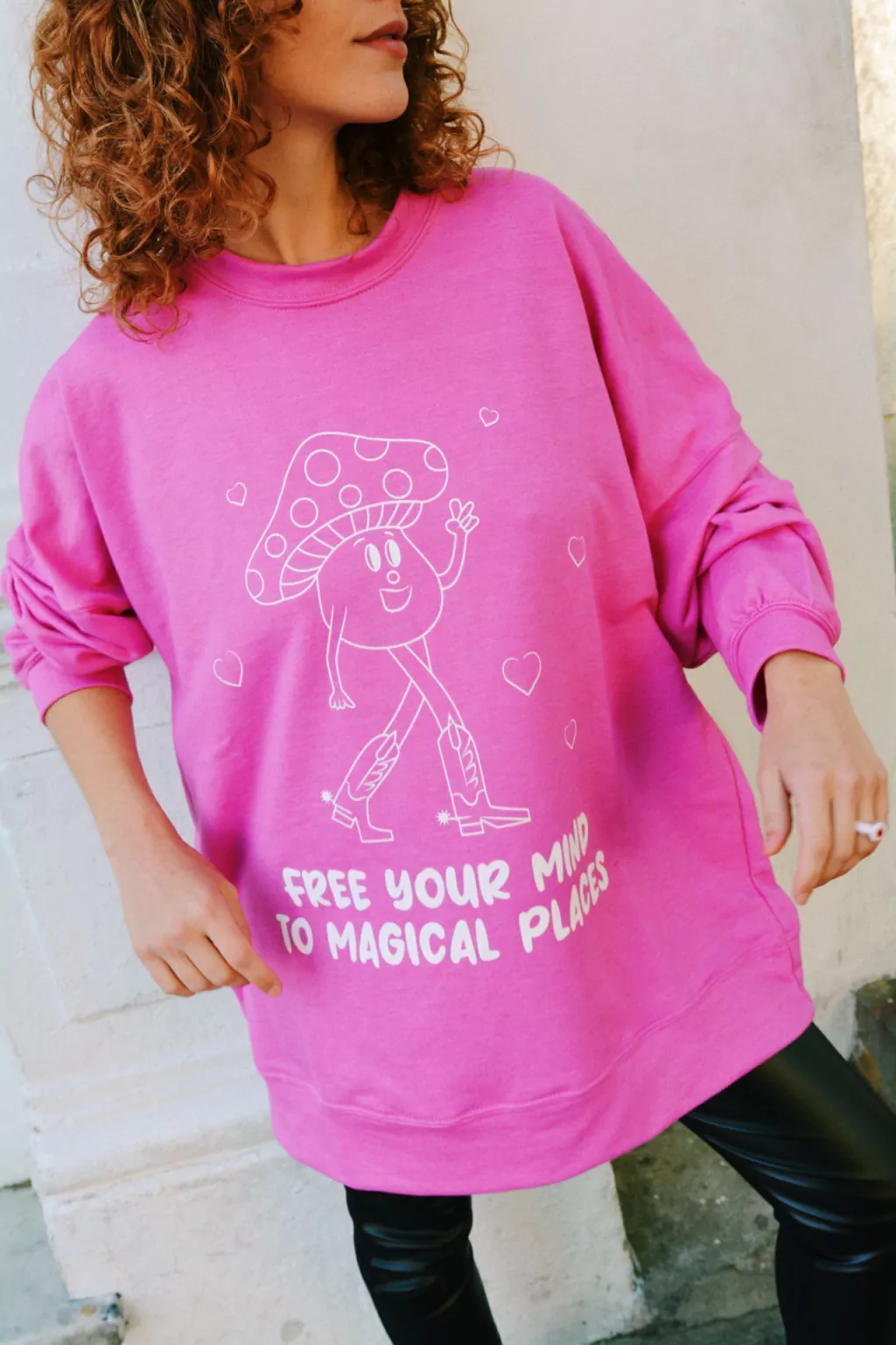 Descripción: Buzo confeccionado en tela rústico premium en color rosa con estampa delantera de Miss Portobella y frase "FREE YOUR MIND TO MAGICAL PLACES". El corte es oversize con cuello redondo y tiene puños en las mangas.