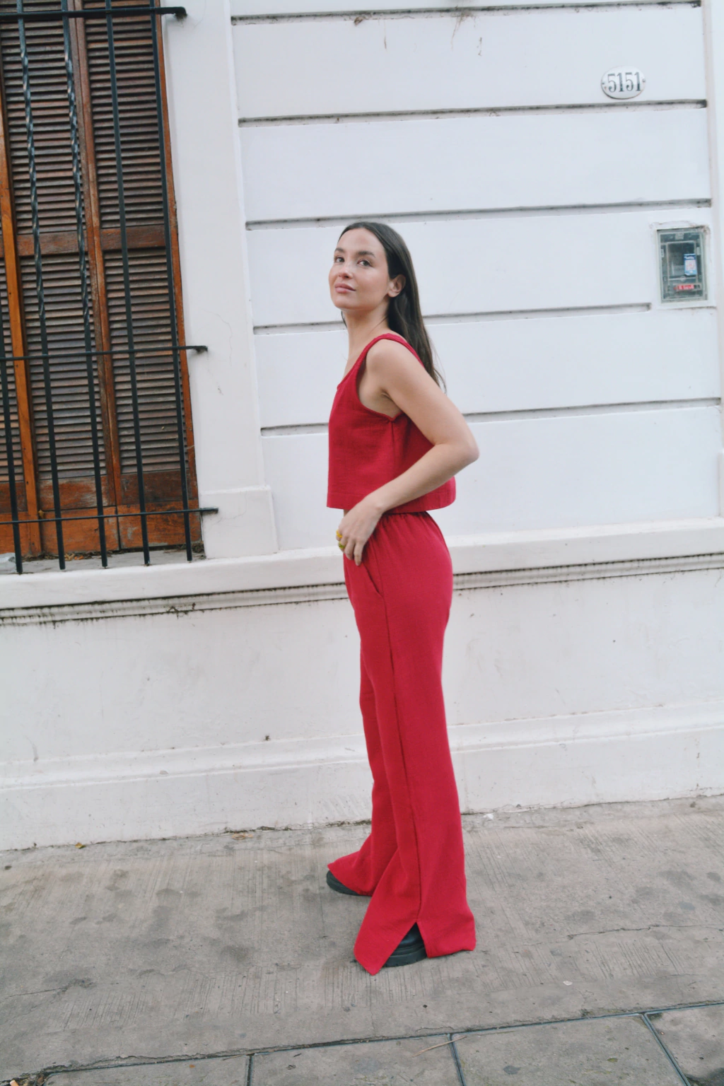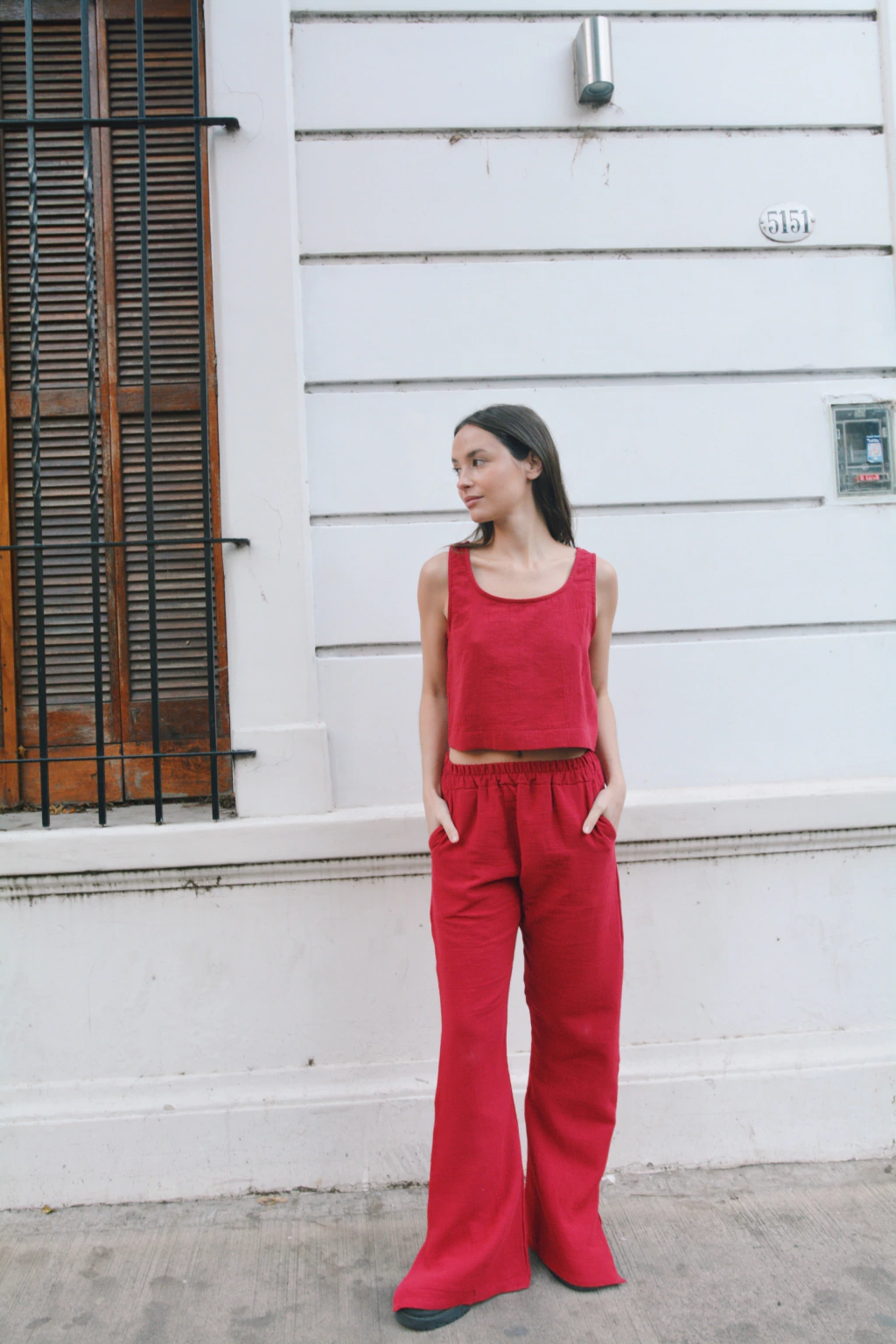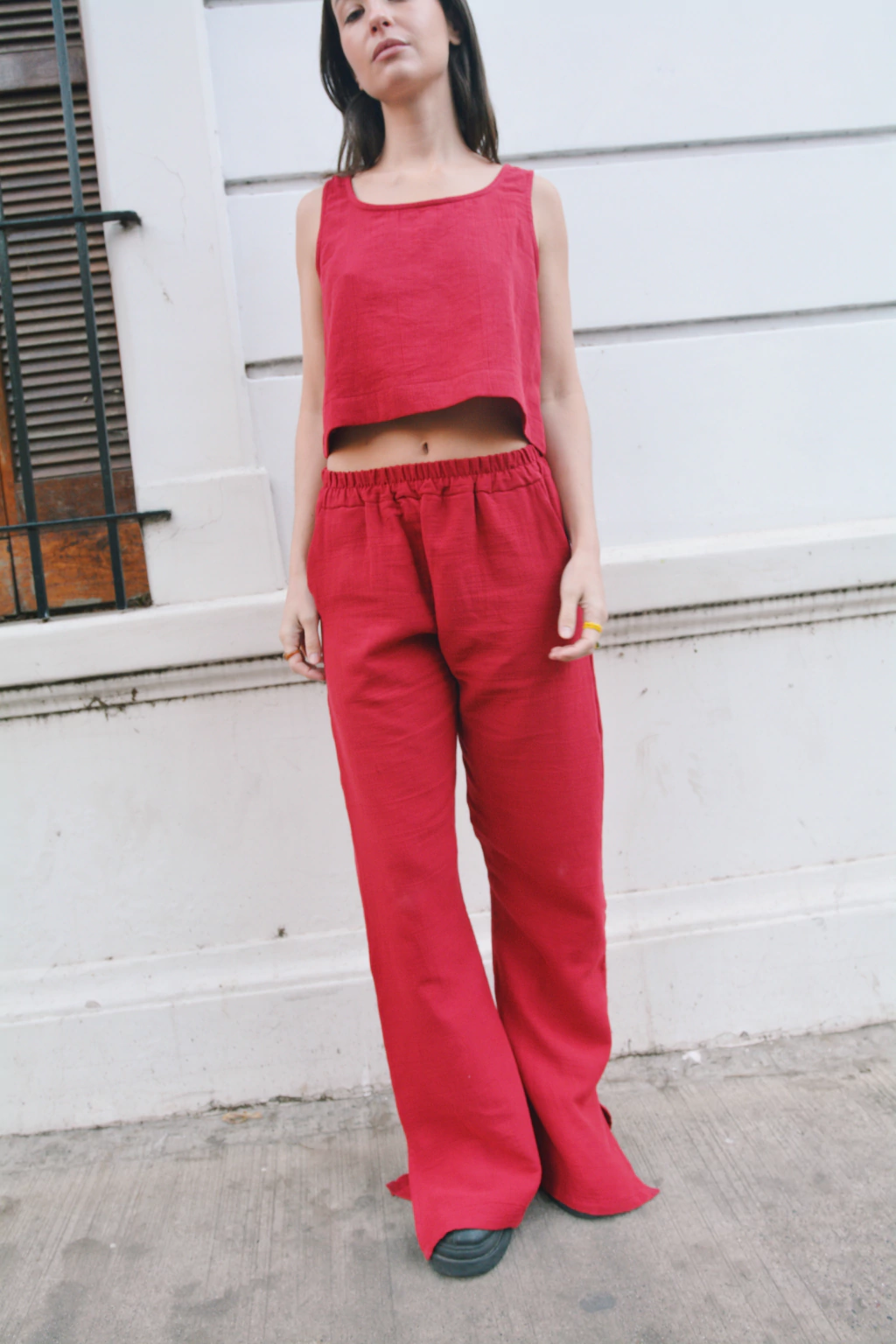 Descripción: Pantalón con corte oxford confeccionado en gasa tusor en color tomate. Tiene tiro alto con elastico, corte en la botamanga lateral y bolsillos.