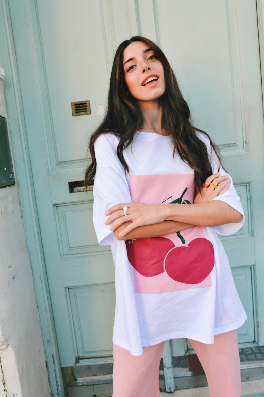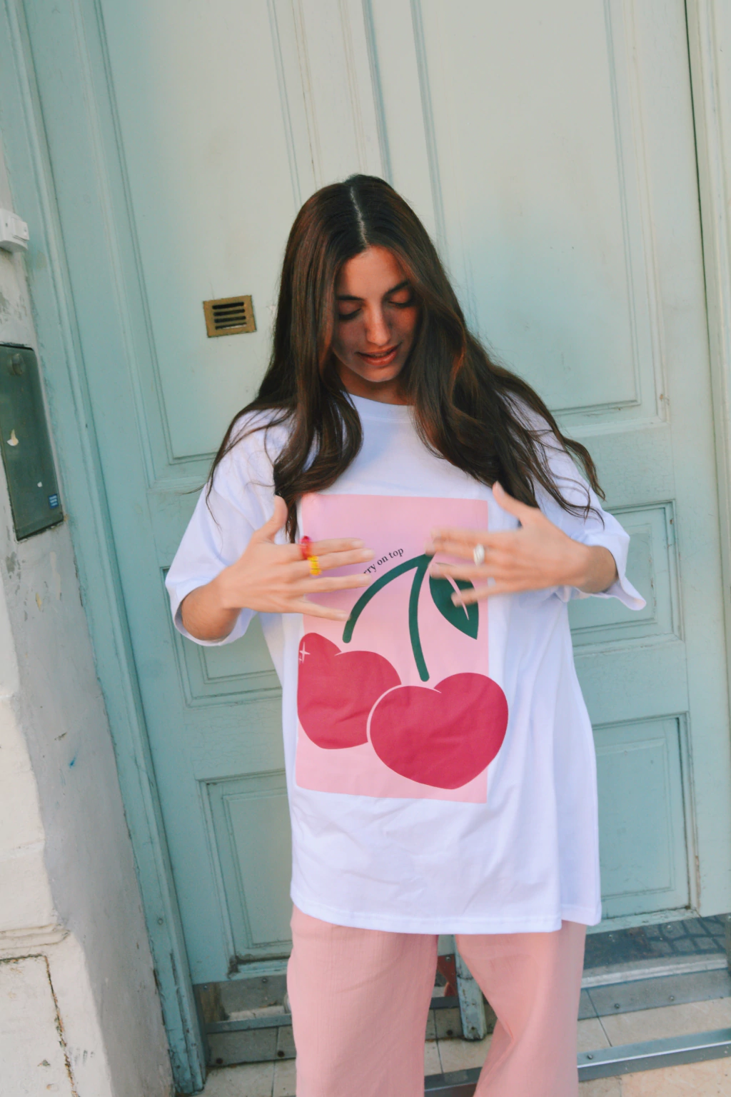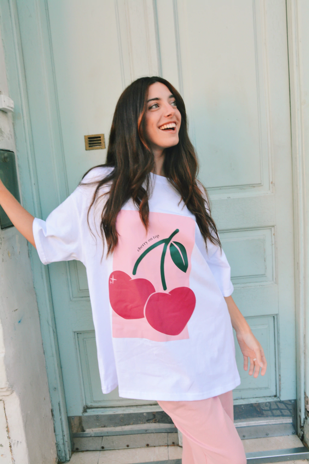 Remerón confeccionado en algodón premium blanco con lycra. Tiene manga corta y cuello redondo con estampa de cerezas en un abase rosa y dice 'cherry on top' de costado.