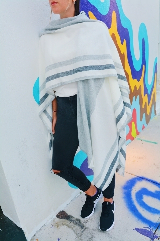 Ruana tipo saco con costura. Base en color crudo con linea en los latereles en gris claro y gris oscuro.