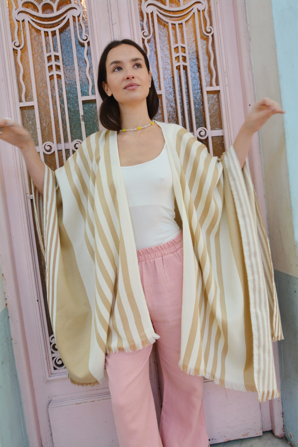 Descripción: Ruana con costura especial en todos los bordes y flecos en las puntas. El diseño es rayado en crudo y beige.