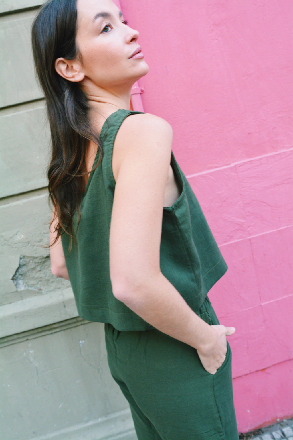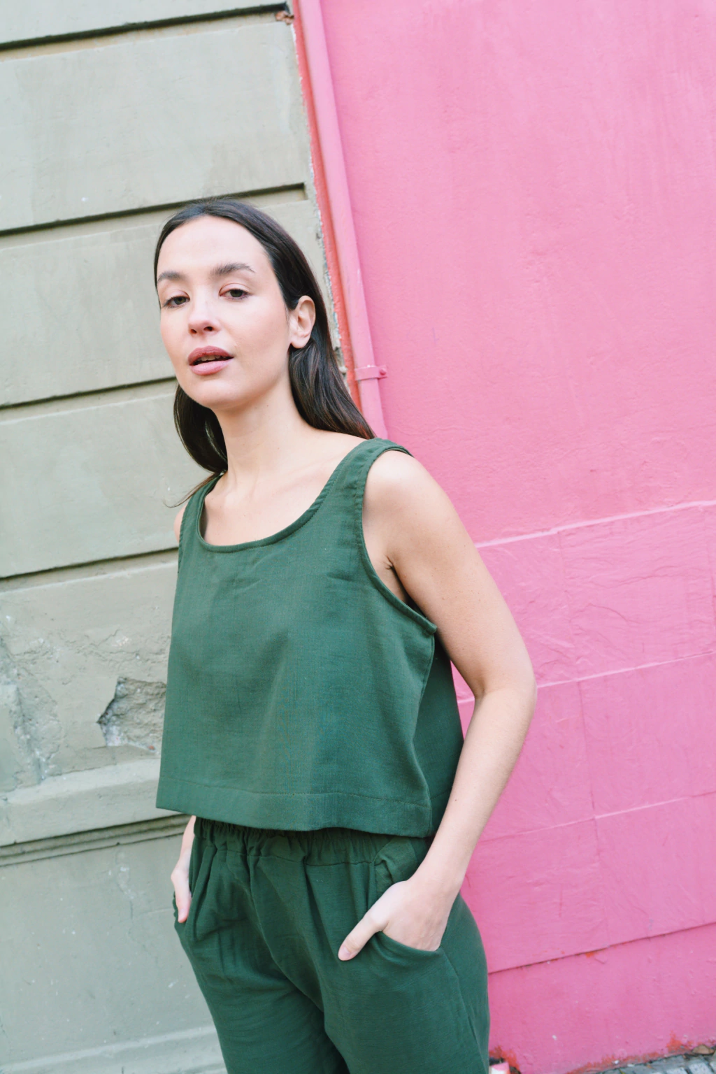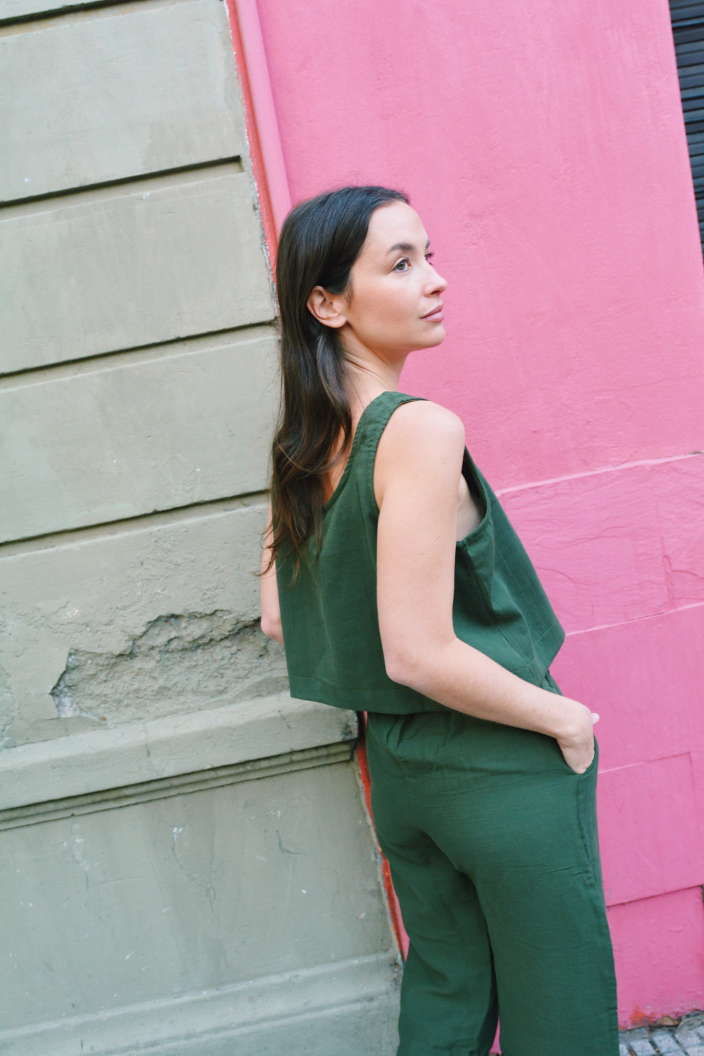Descripción: Top recto confeccionado en gasa tusor verde militar con escote redondo.