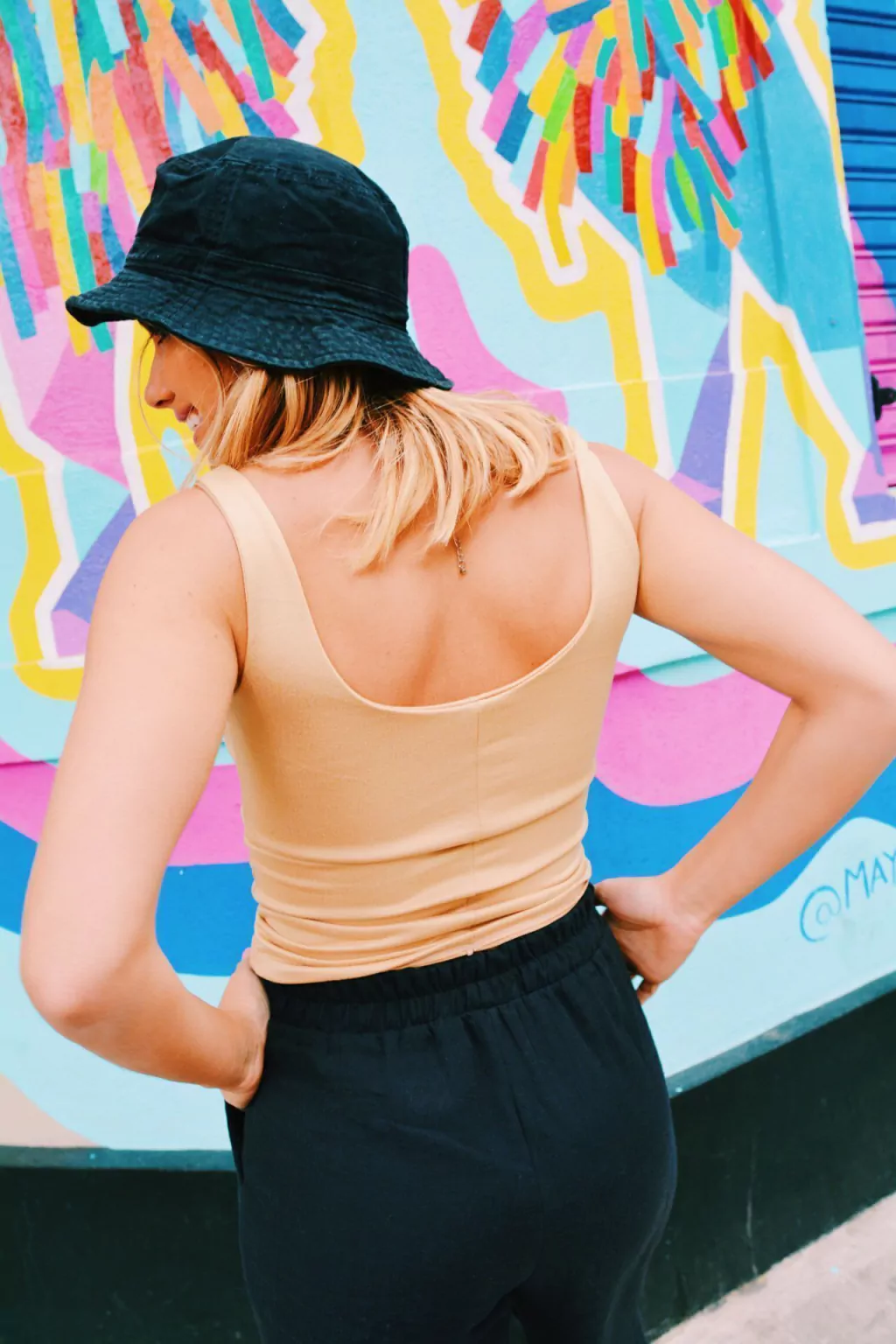 Descripción: Top de lycra premium con corte recto en color beige. Tiene doble tela en la parte del busto para agarrar bien.